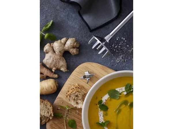 Multifunktionskniven: Kan anvendes til det meste. Den hakker, purerer, blander, moser og knuser ingredienserne. Perfekt til at purere babymad, blande omeletter eller mose frugt og bær til syltetøj.
