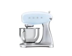 Retro køkkenmaskine i formpresset aluminium fra SMEG i en smuk pastelblå farve. Med denne køkkenmaskine er du dækket ind i forhold til de udfordringer, du møder i køkkenet i hverdagen eller når der skal eksperimenteres med lækre opskrifter til weekendens gæster.